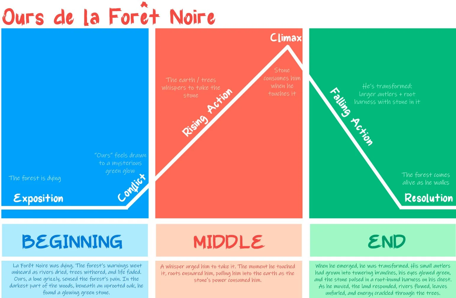 Ours, a lone grizzly, sensed the forest’s pain. In the darkest part of the woods, beneath an uprooted oak, he found a faintly glowing green stone. A whisper urged him to take it. The moment he touched it, roots ensnared him, pulling him into the earth as the stone's power consumed him.